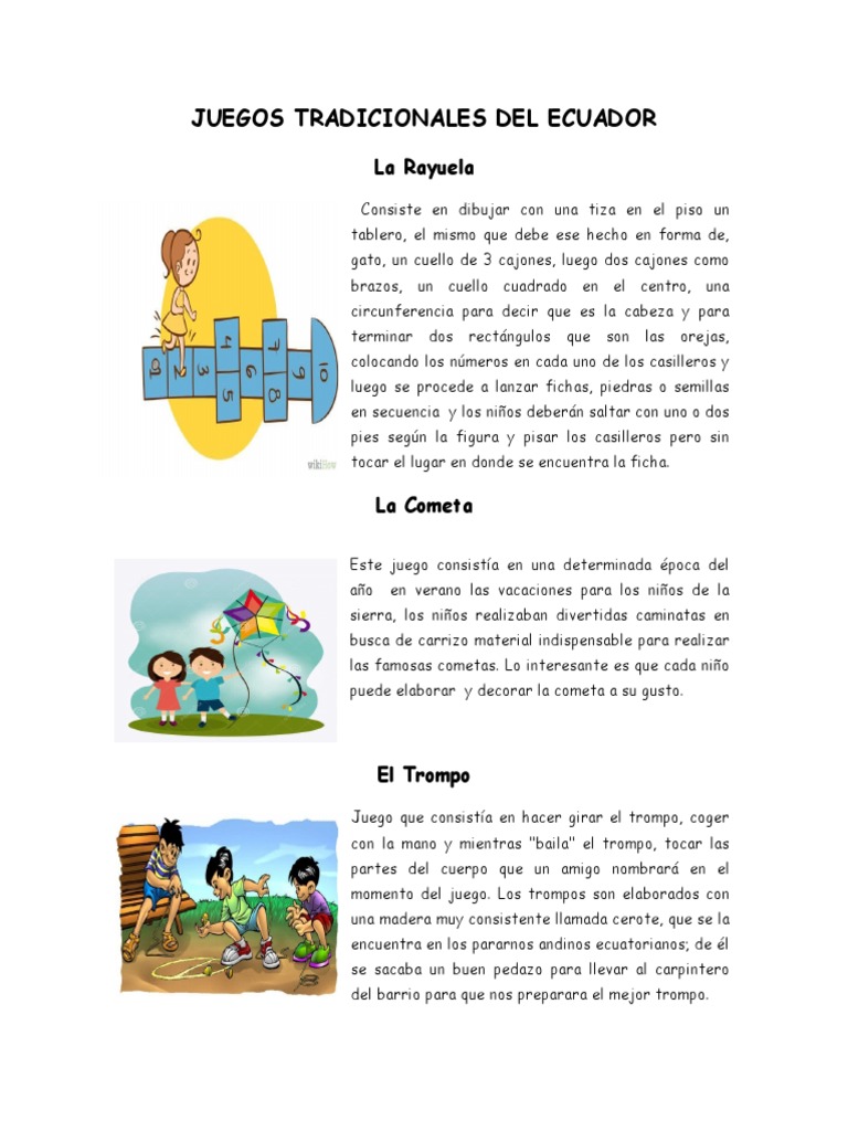 La bomba <ul><li>juego practicado por niños y jóvenes. Objetivos específicos incentivar a las educadoras a practicar juegos tradicionales dentro de las. Es un juego tradicional, pero también se realizan competiciones de cometas en las que participan principalmente adultos; Monedas que corren se puede jugar con monedasbot. Este juego puede ser jugado en solitario o en grupo, según queramos. Lee los siguientes juegos y determina cuáles pueden ser perfectos para tus niños, ¡o para el niño en ti!: Miércoles, 8 de mayo de 2013. Los juegos tradicionales del ecuador sobreviven a pesar de la introducción de la tecnología en forma de móviles o videojuegos, más propios de otros países. A continuación alguno de los juegos tradicionales mas populares de nuestro. Juegos tradicionales y sus reglas. Agua de limón es una ronda dirigida a los niños en la que van interactuando y cantando en una sola voz hasta que la voz guía o líder da la consigna de formar grupos de diferentes números de integrantes o participantes. Varios de los juegos se asemejan a los de otros países latinoamericanos, sin embargo, otros son propios del país o de las comunidades. Día tras día nos quejamos que nuestros hijos solo saben jugar con máquinas, que.